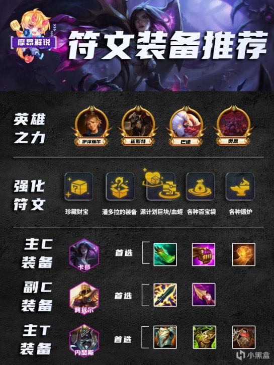 传说之力摩昂推荐伊泽瑞尔、崔斯特、巴德、奥恩这些给予装备的,3个符文都可拿(除了辅助装),因为我们的阵容高司令就能提供不错的法强,类似与魔杖符文,所以我们尽量多的去拿装备多养几个c位出来。