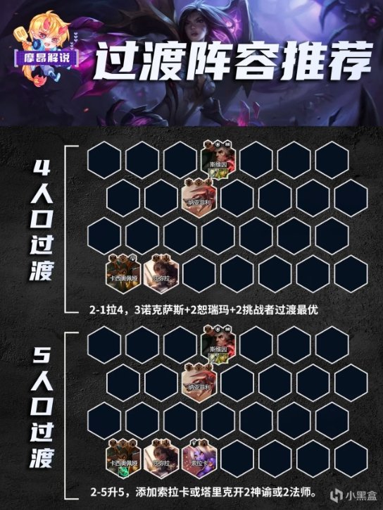 2-1拉4,2-5升5过渡阵容看来牌选择,比较推荐3诺克萨斯+2恕瑞玛+2挑战者+2神谕最优,其次2斗+2恕瑞玛+2神谕或3虚空+2斗+2法师大家只要保障场上战力拉满就行。