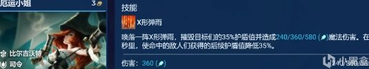 厄运小姐在更新后技能伤害全等级加强,法力值削减到50,增加了厄运小姐释放技能的频率,在释放技能后能快速压低敌方前排棋子的血量从而更好的帮助阵容完成收割,其技能对带有护盾的敌方棋子,摧毁35%的护盾,后续被命中的棋子再次削减35%的护盾值,大幅度降低了敌方带护盾棋子的坦度(堡垒/瑟庄妮)。