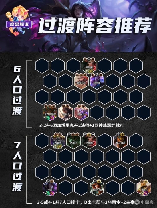 3-2升6人口如诺克萨斯过渡添加2法师+2巨神峰羁绊就可,其他过渡看场上羁绊补羁绊就行。