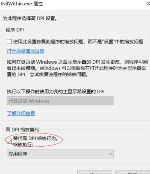 勾选“代替高dpi缩放行为”,并点击"确定"
