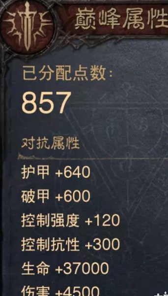 这套是860级的巅峰加点,伤害4500,破甲600,护甲640三大输出拉满,血量3W7,控制抗性300,控制强度120。点出了不败之地PVP,点出了鬼斧神工作为魔神秘境的主要输出天赋即可。