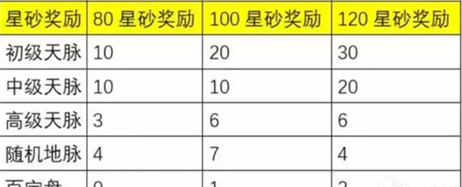 若当前周目累计获得120星砂,三种奖励总计可得:初级天脉60个、中级天脉40个、高级天脉15个、随机地脉15个、百宝盘3个