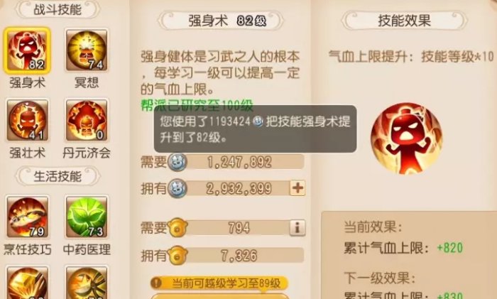 那么将这些技能全部越级提升到89级,可以提升最大气血值100点,提升最大魔法值100点,气血比例上限2%,药物额外恢复能力5%,总消耗大致为:2.8亿银币+3万帮贡