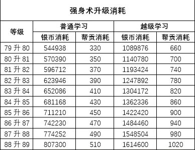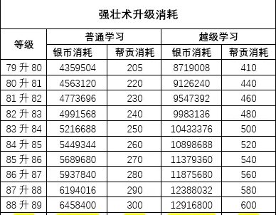 视帮派学习指数为100,精锐玩家的越级学习强壮术消耗如下