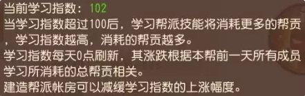 视帮派学习指数为100(学习指数越高消耗帮贡越多)