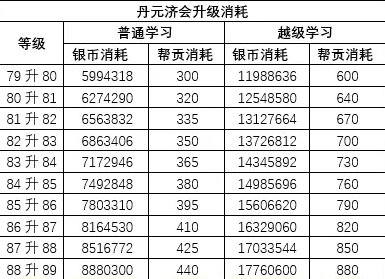 视帮派学习指数为100,精锐玩家越级学习丹元济会消耗如下