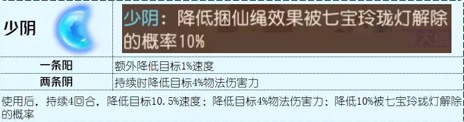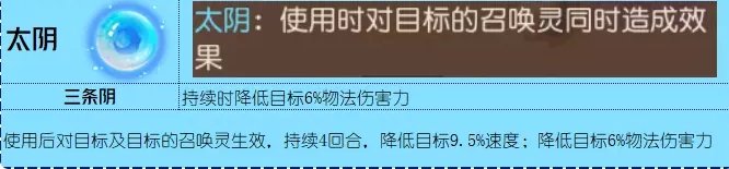 太阴能够降低目标最高6%物法伤害力,物法伤害力的降低是即刻生效,就算被七宝解除,那么也有至少一回合降低两个单位的物法伤害的效果,这就限制了目标的门派,如果是对辅助使用,那么意义也不大了
