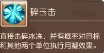 此技能号称晚歌第一坑技,因为一旦有单位被冰冻,晚女神就去碎玉击了,直接破冰,然后以较低的命中率,对另外两个单位进行月凝