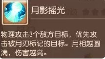 以月刃为主要出手方式,攻击目标一般为敌方输出型单位,偶尔会使用月影摇光,具体什么时候使用月影摇光比较随意,至今也难觅其中规律