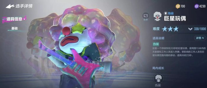 这个道具属于辅助型道具,干扰莫比乌斯方面还是不错的,破译型天狼星可以选择这个道具。此道具在破译时可以起到干扰作用,建议在人较多的地方放置巨星玩偶,能够很有效的拖延莫比乌斯找到天狼星的时间。当被莫比乌斯发现时,天狼星应移步至角落处或是莫比乌斯视觉盲区再释放道具,因为玩偶会在天狼星脚下放置,会导致极易被莫比乌斯发现