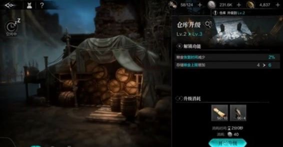 在营地,我们主要是升级仓库与中军帐,仓库可以减少粮食恢复时间、增加存储粮食上限。升级中军帐可以提升佣兵名单上限数量上限,解锁更多的关卡信息。