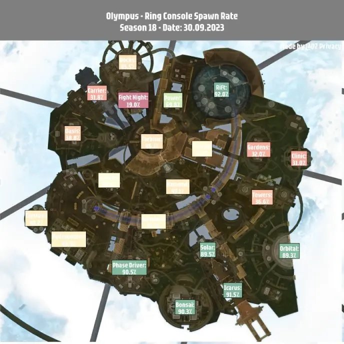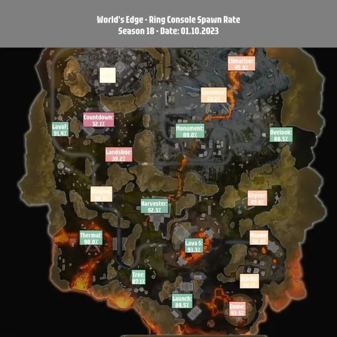 最后附带另外两张ALGS-Year4比赛地图奥林匹斯和世界尽头的每局游戏探圈信标刷新几率图,还是由DZ数据挖掘师Privacy统计。