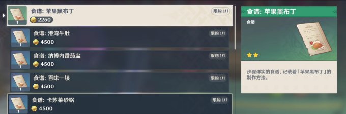 ●枫丹「德波大饭店」:「苹果黑布丁」、「港湾牛肚」、「百味一缕」、「纳博内番茄盅」、「卡苏莱砂锅」;