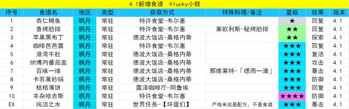 (3)文末仅展示4.1新增的10个食谱的表格,并补充1个特殊配方的获取,包括了角色特殊料理以及食物类型。
