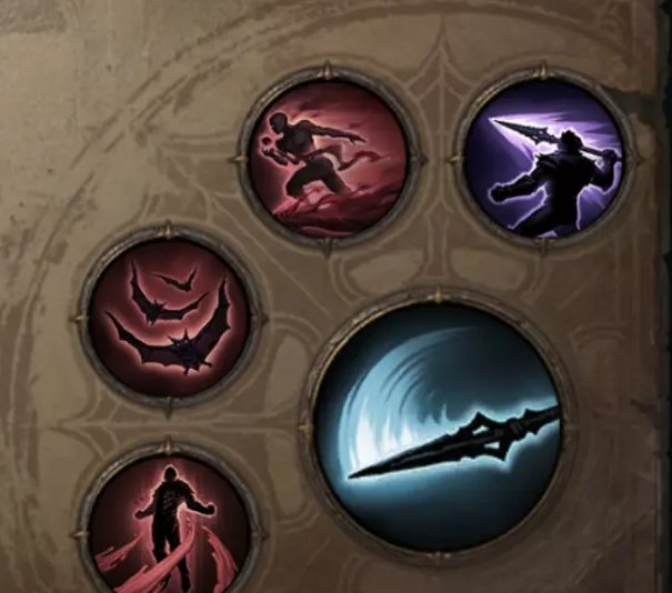 这是混沌秘境的5个技能,普攻没有给我们远程的锋刃(不然难度还要降低)除了蝠声掠影和引渡吞噬还有潜行怒袭(保命技能)和暗影长枪(可蓄力的远距离技能)