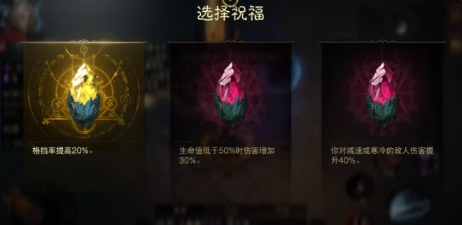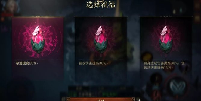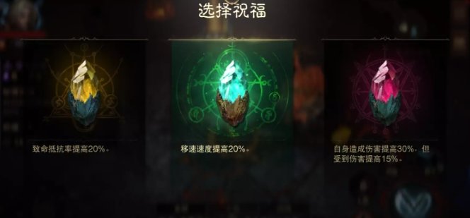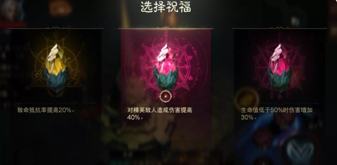 4次选择基本都是拿防御或者表明上能用的提升,哪怕不是很有用都没关系,像生命值就没有低于50%过,所以这种祝福是没用的。致命抵抗率也没必要,打PVE这个收益很低。