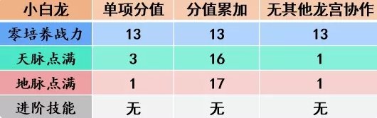 小白龙较为需要其他龙宫单位配合,这样才能具备更高概率的清心能力,与西海龙王配合才能更好地发挥伤害能力,一般,西海双龙联合出战,白龙战力17星,若无其他龙宫协同战斗,最低战力15星