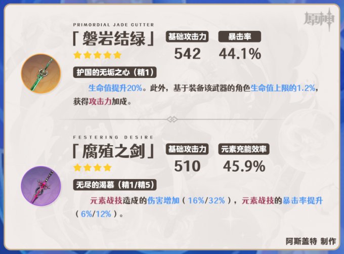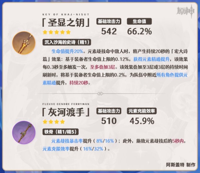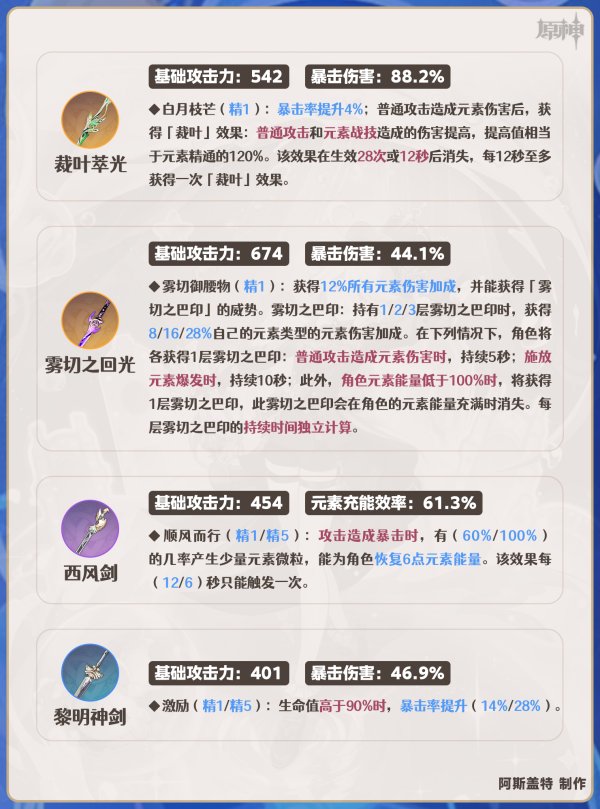 ①裁叶萃光:基本只能利用暴伤加成、武器技能的暴击提升。不搭配艾尔海森且没有更合适的武器时可考虑。
