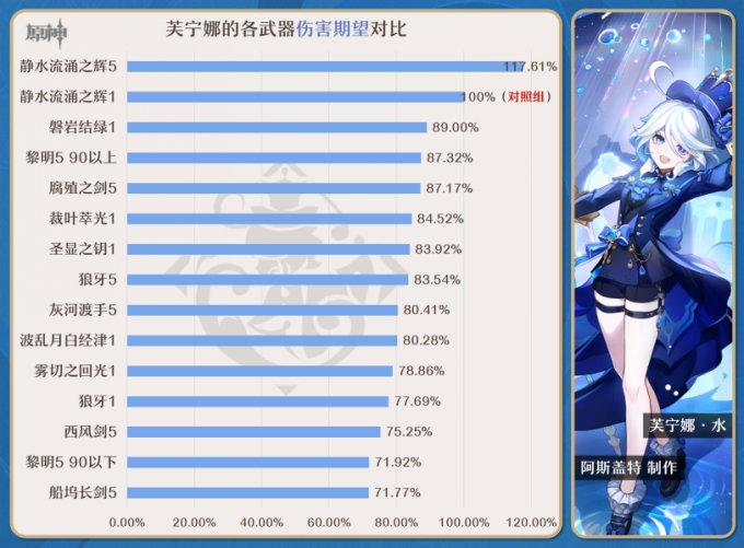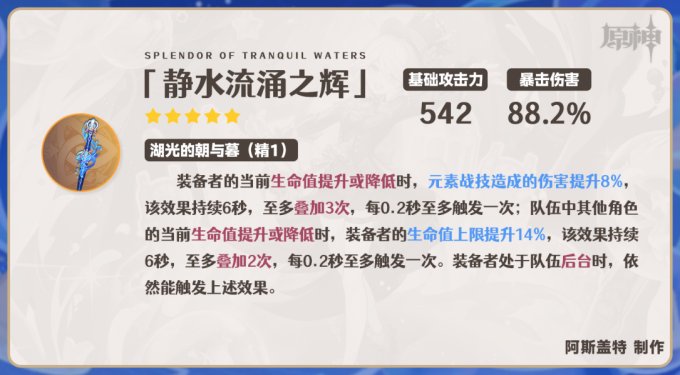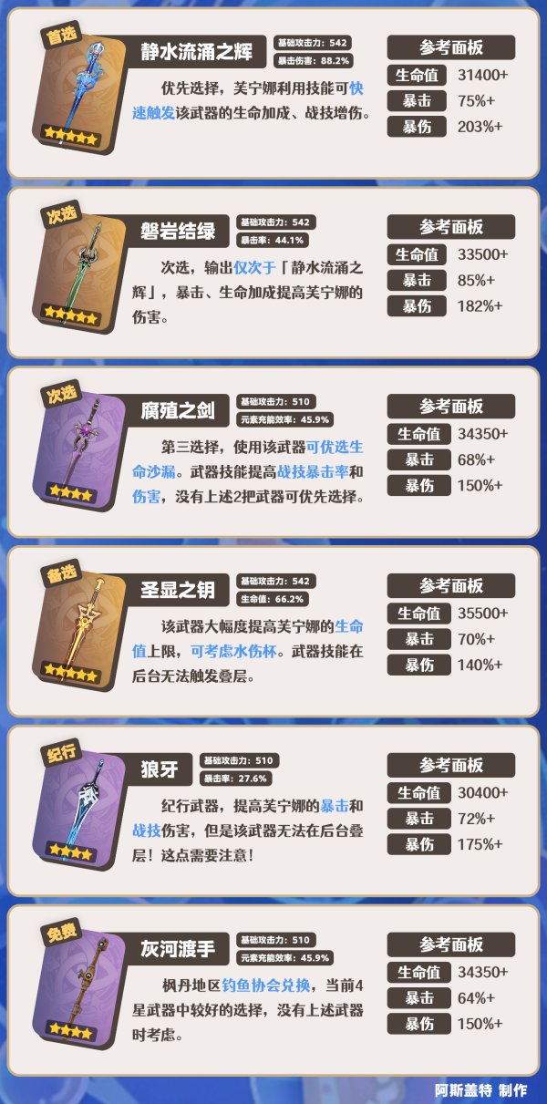 ①输出武器的次选,与「静水流涌之辉」的差距最小。副属性暴击率加成降低芙宁娜的暴击率需求,此时圣遗物可以优先考虑堆叠暴击伤害、百分比生命加成。