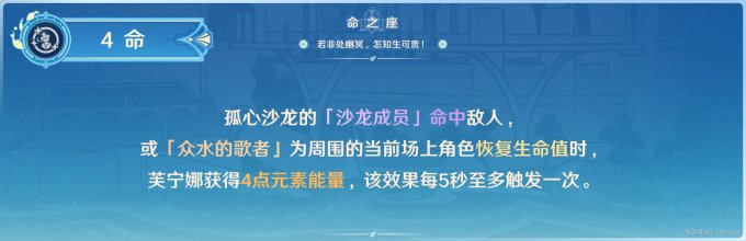 E不管是召唤沙龙成员还是众水的歌者,都属于常驻状态,4命效果相当于就是每5s就可以为芙宁娜提供4点元素能量,可以有效的缓解芙宁娜的回能压力。也可变相理解为芙宁娜的Q只需40点元素能量启动。