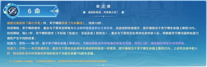 ※总的来说,每个命座都挺实用,但个人建议主要考虑高级的2命和6命,其次再考虑其他命座。大概意思就是原石不多捞个0命先培养,然后原石还有库存可试下手气搏一下1命和2命,优先考虑2命再考虑专武静水流涌之辉。