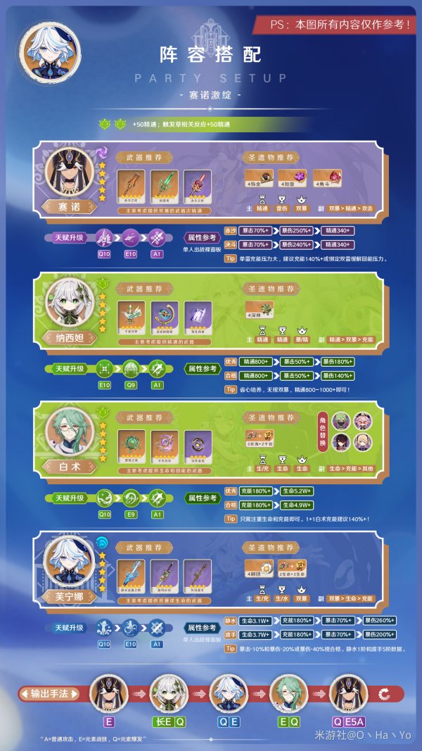 原理和海森激绽类似,只是把雷系角色搬到了驻场位置,不同的是赛诺比较依赖挂草能力强的纳西妲,没有纳西妲时可用草元素主角替代一下。