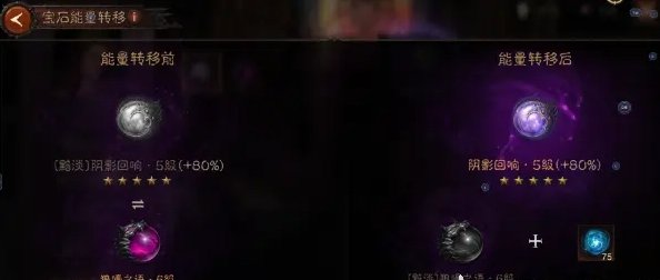 通过能量转移我们可以直接把已经培养成型的传奇宝石中的能量,直接转移到黯淡的宝石中,和抽离能量一个意思,会更加方便快捷。总之一句话宝石能量守恒,如果转移过程后能量溢出,或者能量不够,溢出会变成宝石结晶,不够也需要补上宝石结晶。