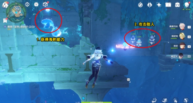 攻击海豹获得战技,长按战技击败敌人,点亮机关,解开第三个封印