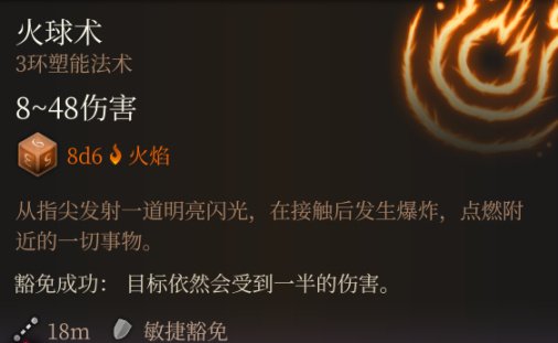 施法者的法术难度等级固定是8 + 施法属性调整值 + 熟练项,只要敌人投掷结果高于这个值就能豁免。比如法师最经典的火球术,描述是这样的:通过敏捷豁免