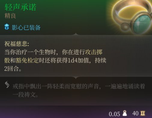 这游戏t0级的神装,从很早开始用到毕业。一开始在瓦罗身上,大概率会在地精商人那里买到,如果没有,瓦罗去营地之后也能交易获得(跟瓦罗对话没有交易选项,可以直接点左下角交易按钮)。自此影心不需要主动用祝福术了,直接放个群体治疗就能给全员上2回合的祝福术,还不会被打断专注。砸血瓶的方式也可以触发。