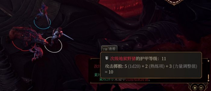 鹦鹉螺上养鸡妹攻击这个AC11的次级地狱野猪,显示的命中率是75%,这里掷了个5差一点没打中。