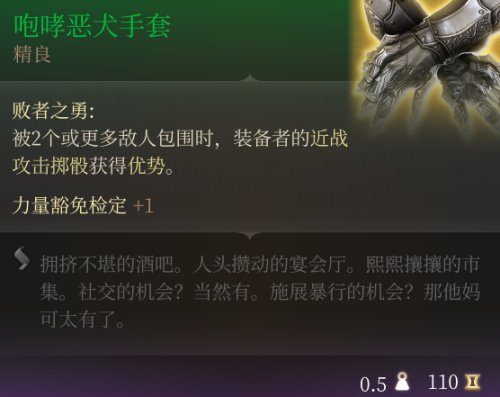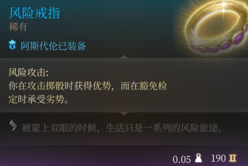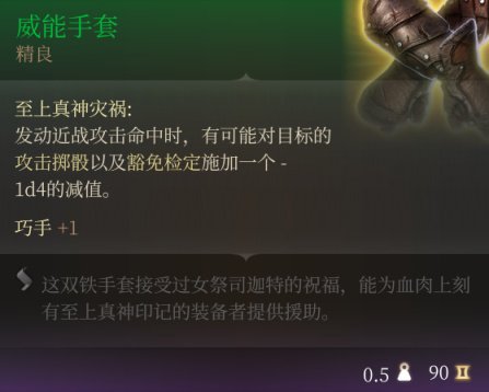 在最开始的林地遭遇战就能在地精尸体捡到这个手套,以前一直觉得没用,直到这周目给我的高魅诗人穿上,才发现基本每下攻击都能触发。按照上面讲的法术豁免来算,我的诗人魅力调整值加成为6,熟练项加成为4,再加上原先基础8,一个没有魅力调整值加成的敌人需要掷到18才能豁免成功,相当于命中之后有85%概率给敌人上灾祸术,所以我的诗人一直用到毕业。
