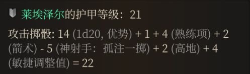 上图是我12级阿斯代伦的远程攻击,中间的+1是射手帽的加成,+2(箭术)是游侠兼职给的风格,-5就是神射手专长,命中率-25%带来伤害+10。