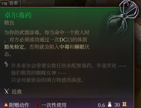 我们知道,中毒的生物发动攻击检定是具有劣势。因此,近身物理攻击的职业可以一开打就给武器上毒,能够很好的给敌人创造劣势。不过要注意矮人基本都免疫毒性,在打矮人的时候要注意这点。不要吝啬你的药水,随时能捡到买到,只要不浪费,根本用不完的。