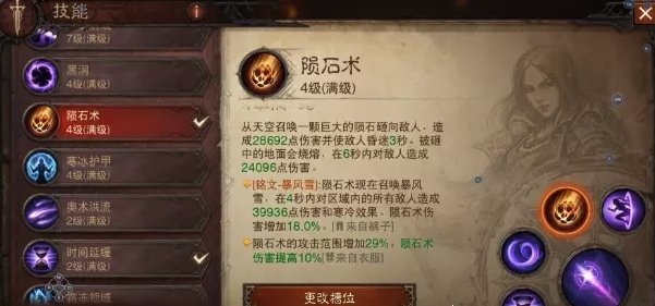 陨石术并不是我们常见的陨石雨,而是暴风雪精华,会对区域内的敌人造成4秒的持续伤害并且带寒冷效果。同时衣服增加陨石术的攻击范围29%,基本可以做到大半个屏幕释放了