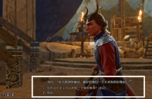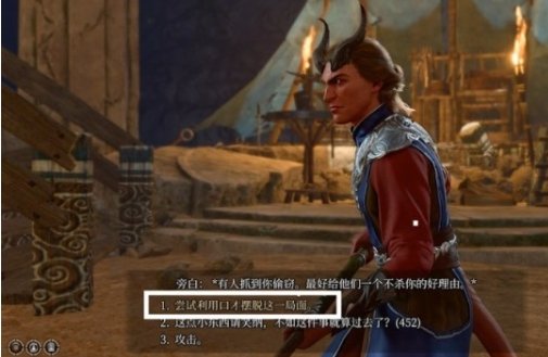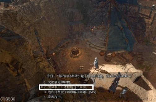 接着我们可以选择等大婶远离后再次强制回合制,直接拿起力量灵药,这个时候其他人也会发现我们。再次选择欺瞒,威吓或游说骗过去