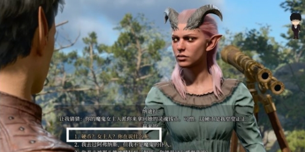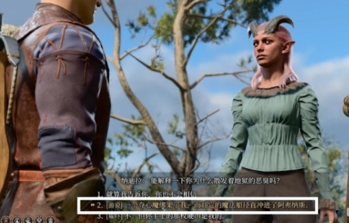 上前舔包后与纳迪拉对话,这里可以有多种方式获取灵魂钱币,推荐对话让对方诚心给我们。选项上就是先1后2,游说投骰子前记得存档防止脸黑