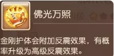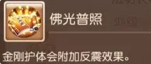 进阶后变成佛光万照,金刚的反震有50%概率升级为高级反震,30%概率反震50%所受物理伤害