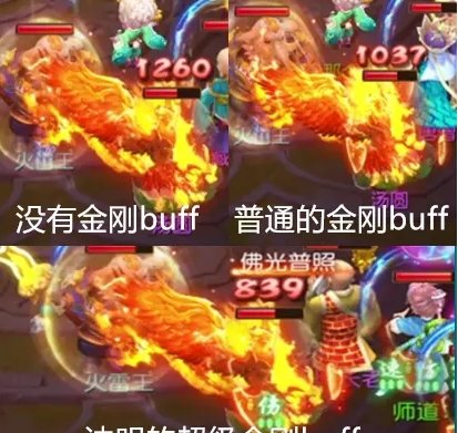 超级强化版金刚buff,法明灵魂技能,整体上看就是双倍的金刚buff效果,能直接抵御任何物理伤害400点左右,这个技能会让猴打猴刮痧,狮驼伙伴摸谁都不再疼痛,不逐一列举