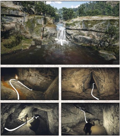 4. 在获得了第三张藏宝图后可前往最终宝藏所在地点。第三张藏宝图所在地点西北方向不远处的极乐池(Elysian Pool)有一道瀑布,穿过瀑布进入后方的洞中,按照下图的路线前行,最终能在圆圈处的石堆中发现宝物 4 根金条。