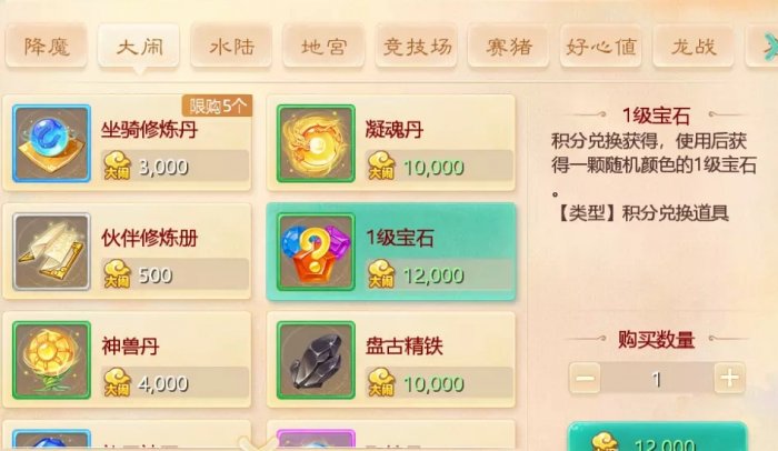 有3个途径可以获得宝石,多宝阁或特卖会等仙玉(RMB)购买、积分兑换、游戏内外活动获得。