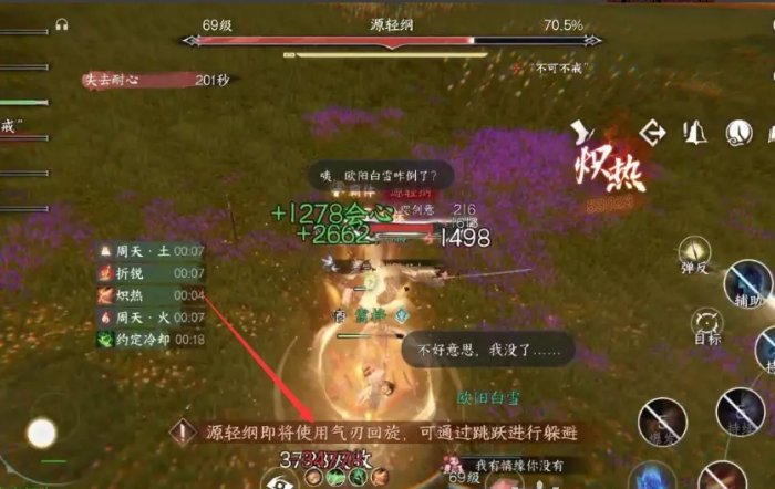 源轻纲以自身为中心,快速挥出两道圆形范围的剑气,对圆形范围内的玩家造成伤害,伤害不高,脆皮离远一点就可以。