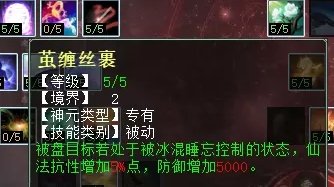 “盘”天赋第二层三个技能,分别是:茧缠丝裹(任务、PK通用,增加被控单位的仙法抗性和防御力),腾蛟起风(任务专用,被盘单位增加气血上限5%),牵丝引线(任务、PK通用,3法盘几率盘6)