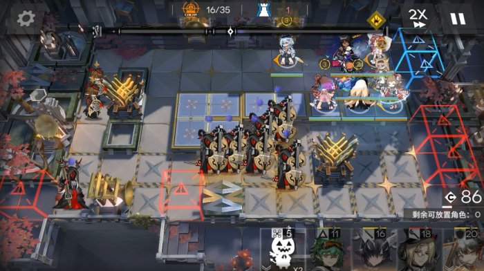 依次部署先锋在号角位置朝左,小羊朝下,煌朝左,重岳朝上,记得开技能到挂机,夜莺朝下,星熊朝上,棘刺朝上,陨星朝左,撤退先锋换号角朝左。煌和陨星3级模组,其他1级。主要压力在星熊这边,最后会暴毙但是能过,练度低的建议最后空降切一下,最后群怪冲家。