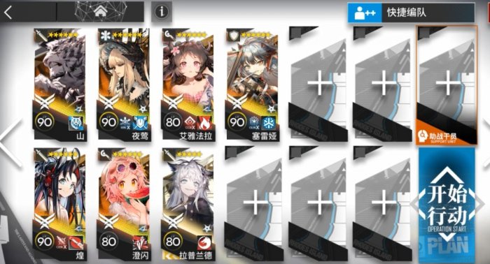依次部署煌朝上,山,夜莺朝右,粉毛朝左,塞雷娅,小羊,拉普朝左。塞雷娅那边费用好了就放。主要压力在右边。右边2人2级模组。
