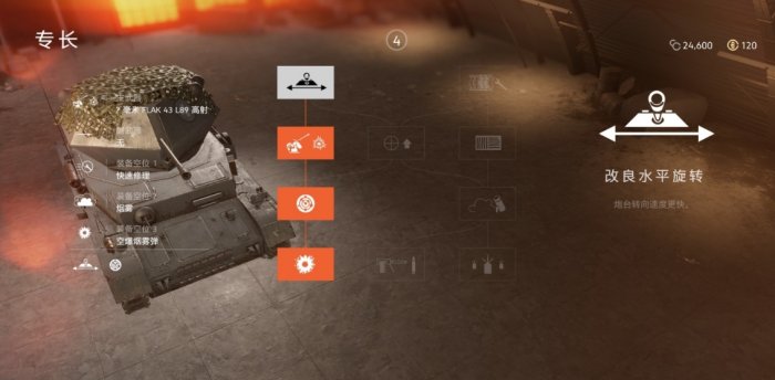 但换来的是更高的伤害,能够在命中弱点的情况下一炮秒杀灰狗/猎鹿犬这种轮战,只不过要稍微吃一些经验(我真的推荐萌新连转车体都不会的情况下点炮台转速)有人可能会问为什么我第2级不选择战地维修而是炮台转速?拜托,虎式坦克本身作为重型坦克转速就慢,萌新连车体跟着一起转都不知道,这两天被我灰狗绕圈圈击毁的虎式已经不是一辆两辆了