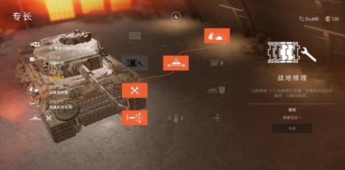 不过我还是要讲一下,战地维修这个专长除了虎式坦克以外碰都不要碰,相较于普通快修随时可以用,用了回33血,战地维修的效果是当坦克出现部件损坏时,才可以使用,修复损坏部件并回15血重点就在这个回复量上,部件损坏在大部分时候都是不致命的(轮战/轻坦除外,它们轮子/履带坏了跑不动那是真的要命),可以通过操作来弥补,但少了的18点血量是实打实的少了,有时候就是差这么一点点,当然,虎式坦克可以点这个专长是因为有bug,不仅可以在部件没有损坏的时候使用,而且回复的血量是快修33+战地维修15=48点,同时可以修复损坏部件