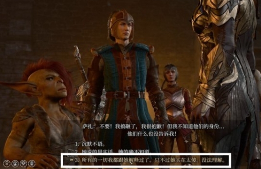 如果是冲着成就去的,可以选择选项2,队伍中有盖尔和卡菈克会有好感度提升。之后第二章月出之塔中会再次遇到萨扎,第三次出手相救就会获得三救萨扎的成就