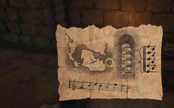 拿起桌子上的藏宝图,同时触发支线任务“由钟声解决”。